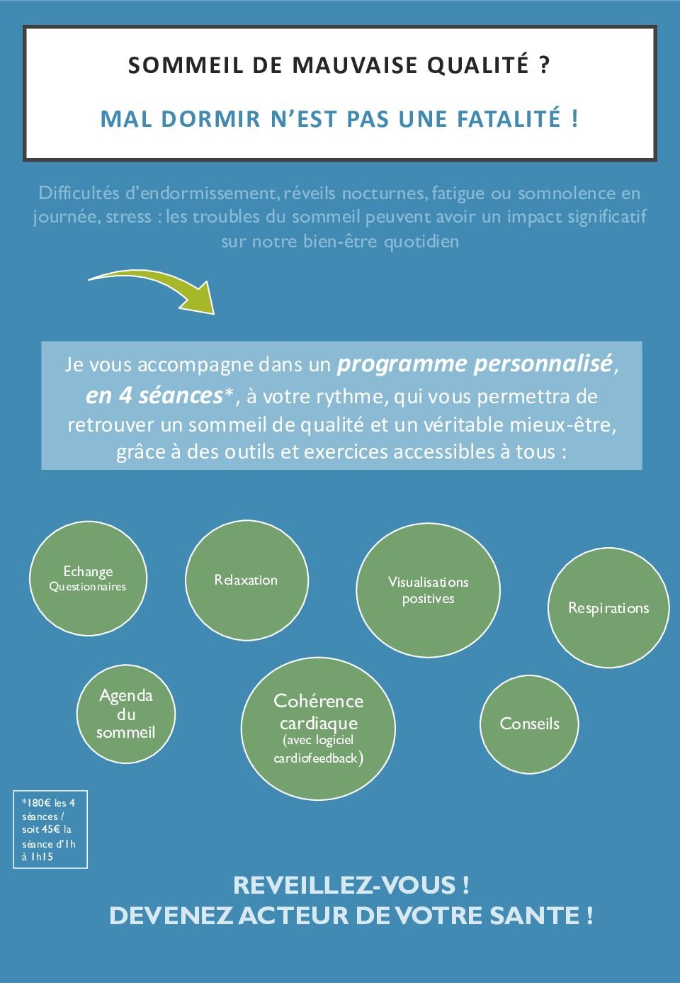 La sophrologie et la cohérence cardiaque ne se substituent à aucun avis ni traitement médical. Les traitements en cours ne peuvent et ne doivent être suspendus que sur recommandation express de votre médecin, même si vous constatez une amélioration au cours ou après vos séances de sophrologie.